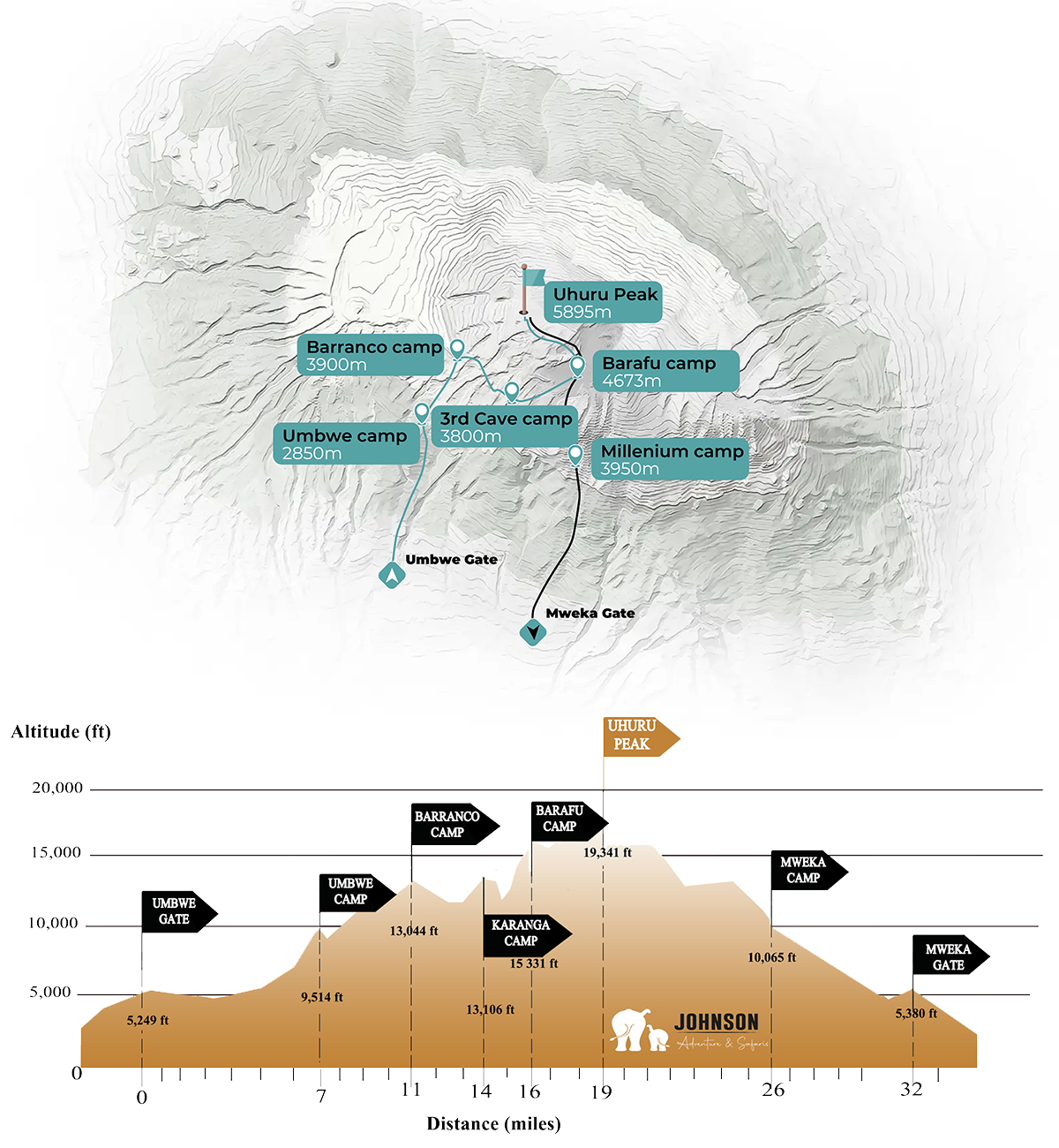 - Elevation: 4,600m/15,100ft to 5,895m/19,340ft (Uhuru Peak), then down to 3,100m/10,170ft (Mweka Camp)